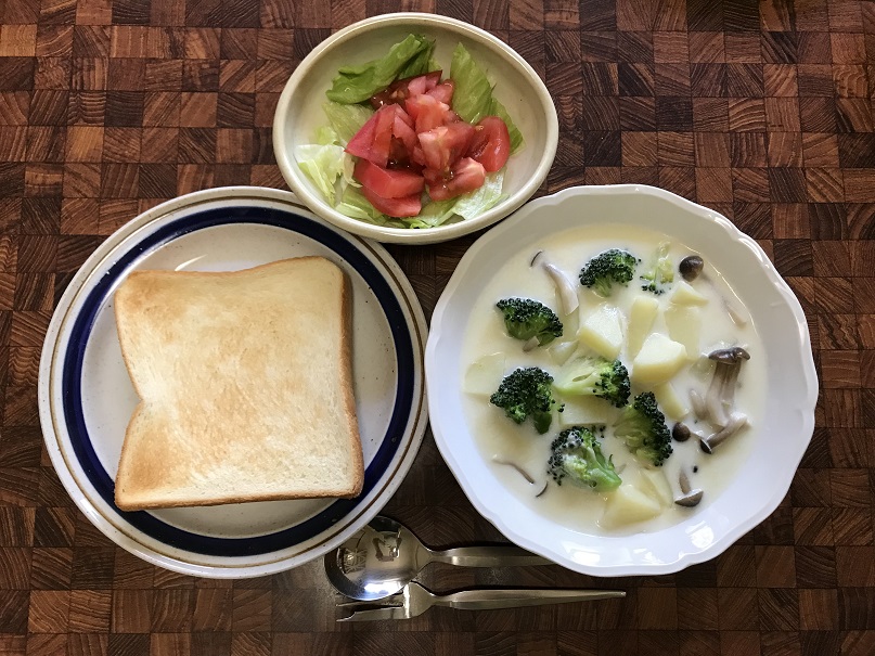 < 豚バラ長芋しめじ塩だれ炒め、納豆、ブロッコリーとトマト、ごま、お豆腐と椎茸と長ねぎ味噌汁 >