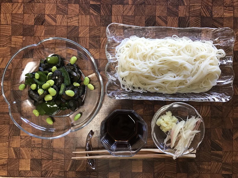 ②茗荷を縦に千切りにし①に混ぜ合わせる。