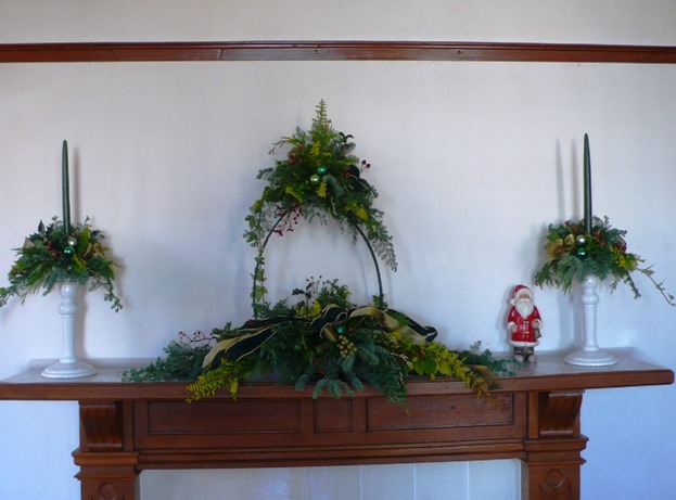 | マントルピース 深いグリーン色のリボン サンタクロースが可愛らしいですね |