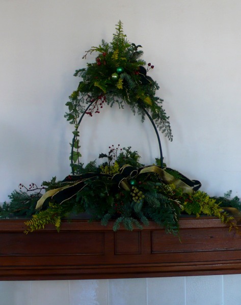 テーブルセンターアレンジはエバーグリーンを基礎にしてテーブルウエアの渦巻き模様をシルバーのリボンで繰り返してあります。ケトルの人々の伝統を思いながら久しぶりに会う家族の楽しい語らいの場です。 |